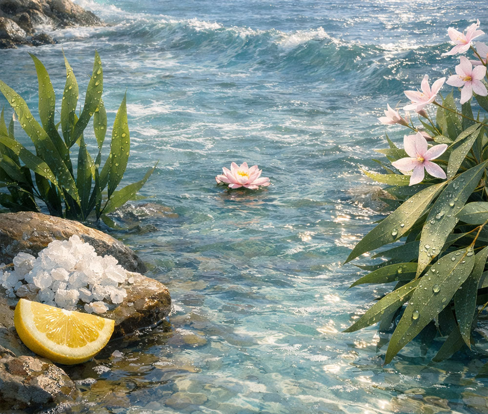 Fresh, watery blend that captures the calm of a serene coastal oasis. Crisp eucalyptus, sea kelp, and delicate lotus petals are finished with a soft sprinkle of sea salt for pure tranquility.